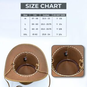 This classic leather cowboy hat for men features a structured crown, curved brim, and a hand-braided leather cowboy hat band that adds a distinctive ranch-inspired finish. The distressed leather texture gives each piece a unique, vintage look — no two hats are exactly the same.
